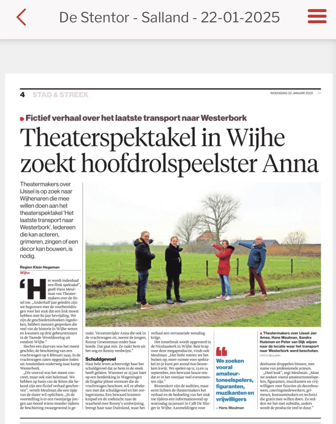 Theaterspektakel ‘Het laatste transport naar Westerbork’ zoekt hoofdrolspeelster Anna Theatermakers over IJssel is op zoek naar Wijhenaren die mee willen doen aan het theaterspektakel ‘Het laatste transport naar Westerbork’. Iedereen die kan acteren, grimeren, zingen of een decor kan bouwen, is nodig.