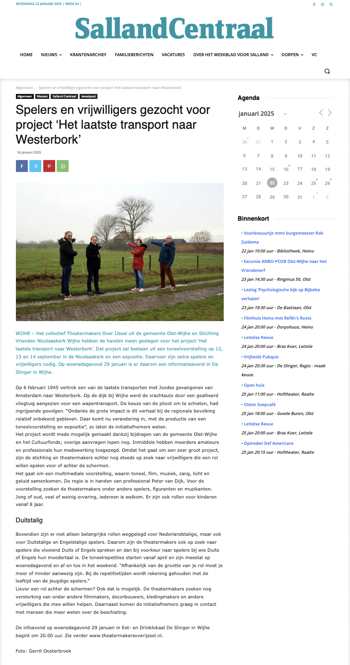WIJHE – Het collectief Theatermakers Over IJssel uit de gemeente Olst-Wijhe en Stichting Vrienden Nicolaaskerk Wijhe hebben de handen ineen geslagen voor het project ‘Het laatste transport naar Westerbork’. Dat project zal bestaan uit een toneelvoorstelling op 12, 13 en 14 september in de Nicolaaskerk en een expositie. Daarvoor zijn extra spelers en vrijwilligers nodig. Op woensdagavond 29 januari is er daarom een informatieavond in De Slinger in Wijhe.